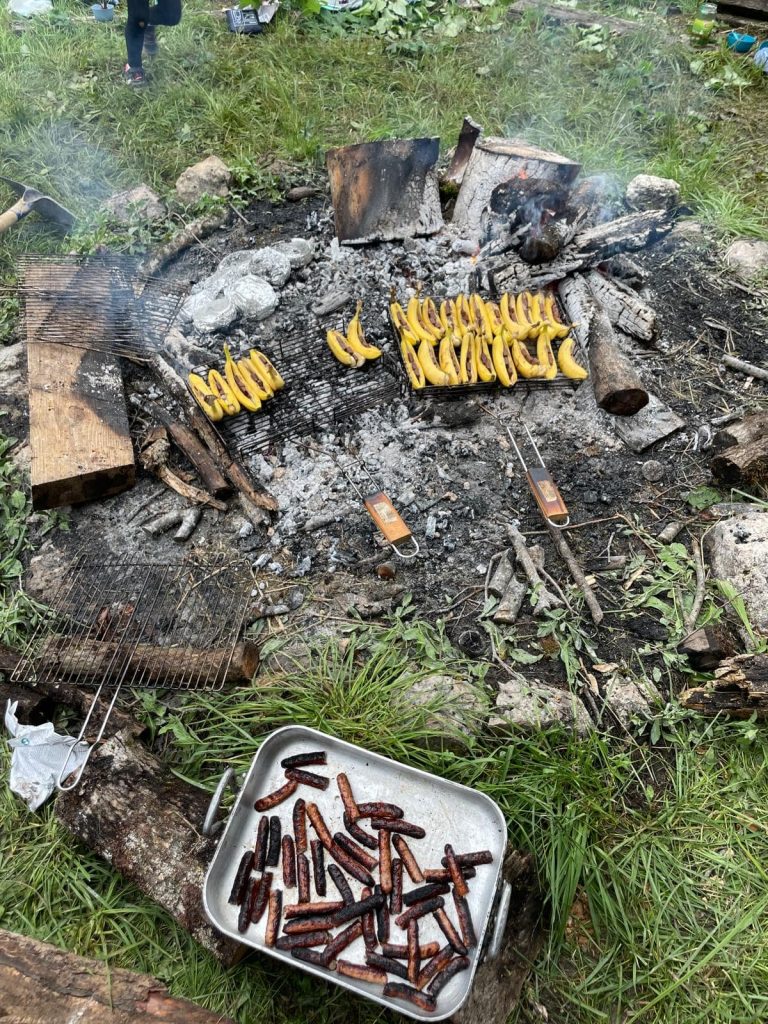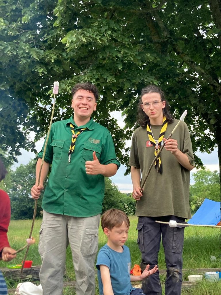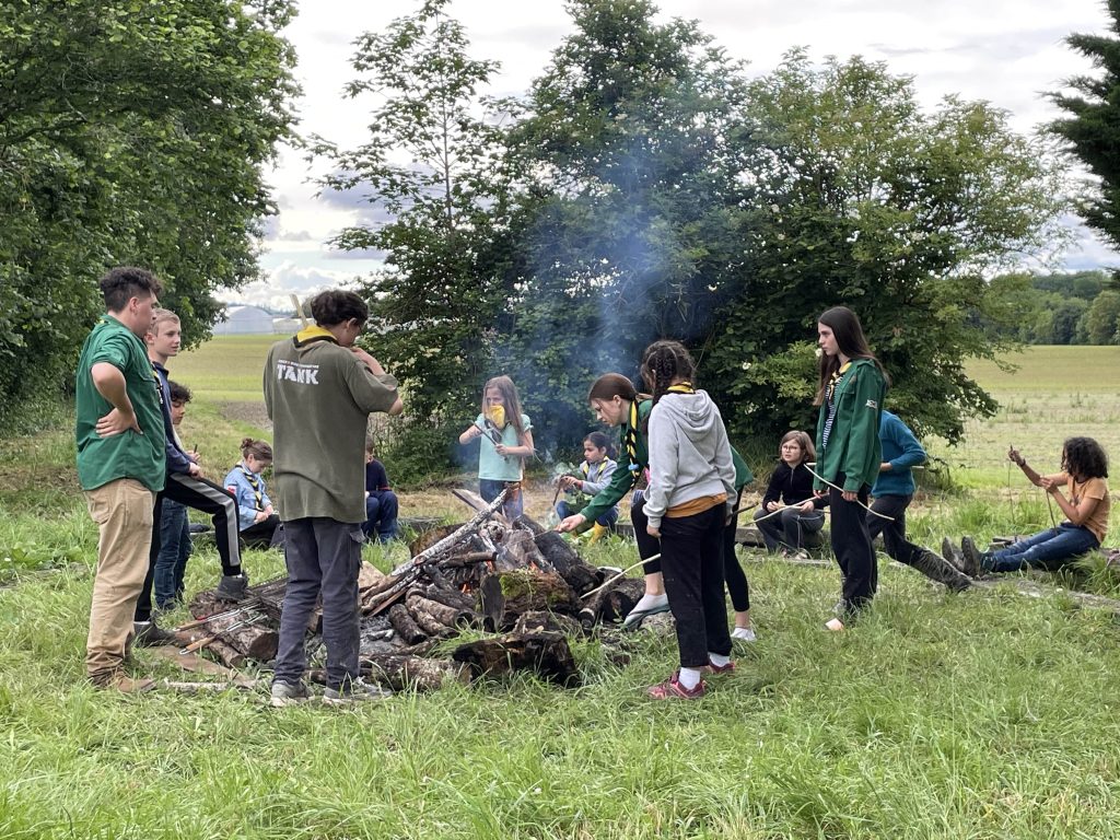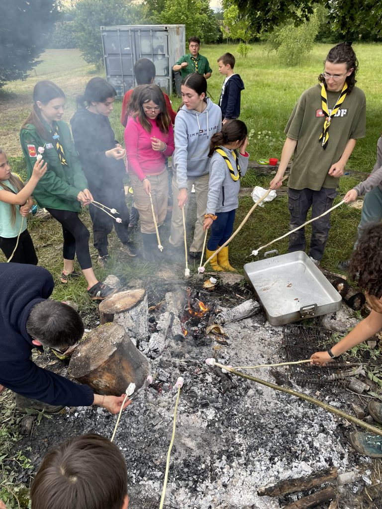 Si chaque branche avait ses activités propres, il y a eu des temps en commun appréciés de tous et notamment le repas trappeur. Chacun taille sa brochette au près du feu qui réchauffe et rassemble. Les saucisses grillent, les camemberts rôtissent, les bananes chocolatent et point d’orgue, les chamallow fondent !
