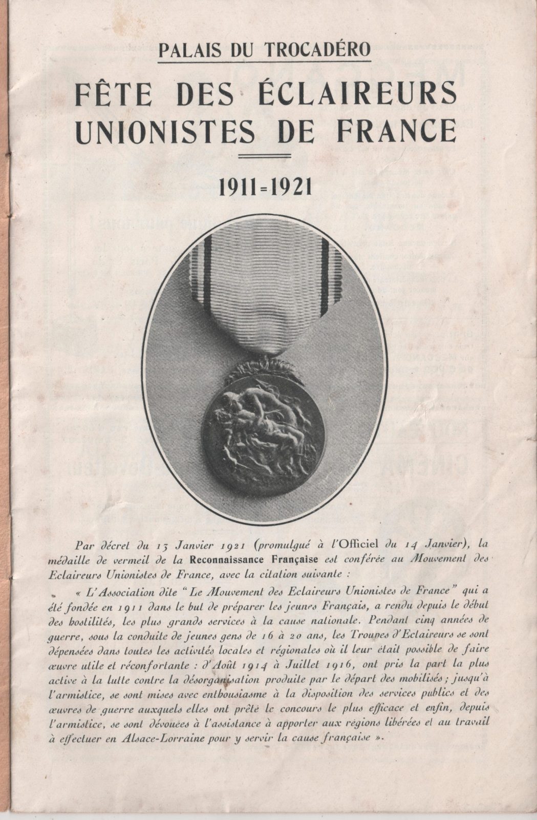 C’est en ces termes que le Président de la République, Alexandre Millerand, a conféré la médaille de vermeil de la reconnaissance française au mouvement des Éclaireurs Unionistes de France, le 13 janvier 1921.