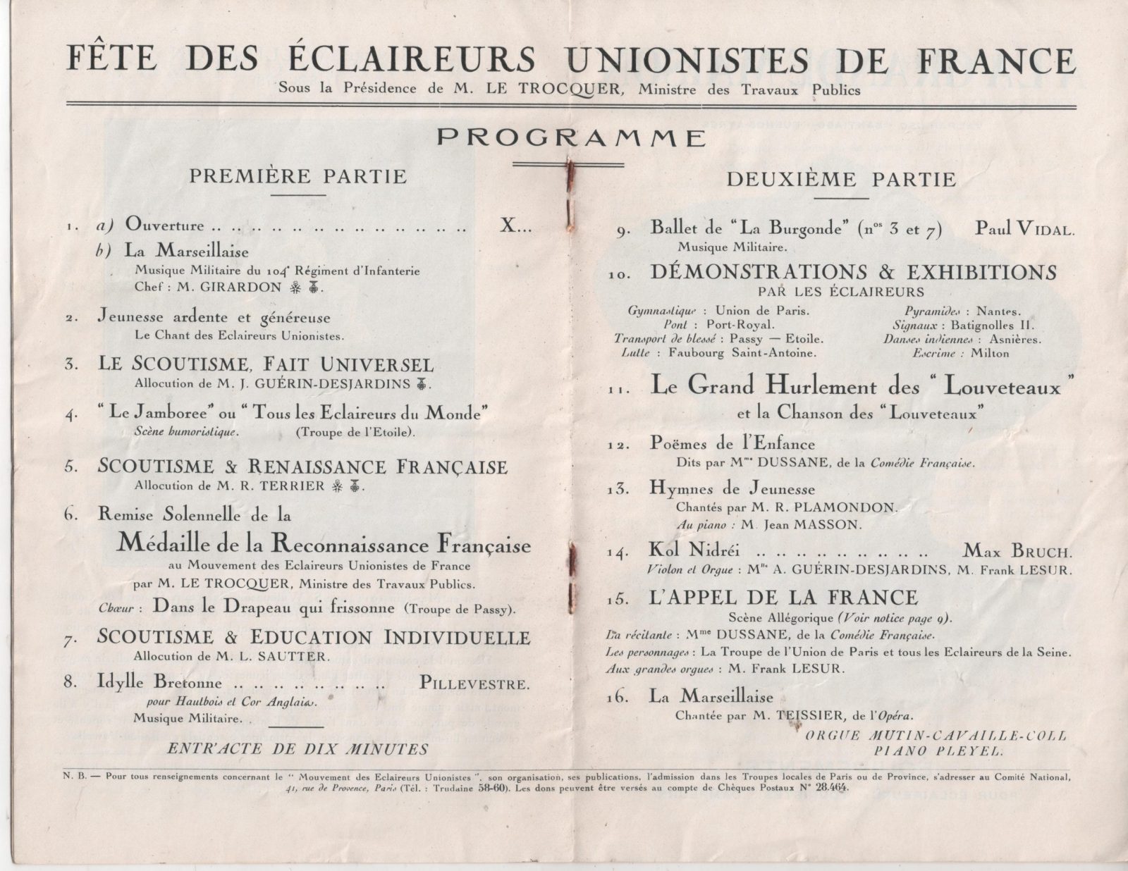 « Pendant cinq années de guerre, sous la conduite de jeunes gens de seize à vingt ans, les troupes d’éclaireurs se sont dépensées dans toutes les activités locales et régionales où il leur était possible de faire œuvre utile et réconfortante ; d’août 1914 à juillet 1916, ont pris la part la plus active à la lutte contre la désorganisation produite par la départ des mobilisés; jusqu’à l’armistice, se sont mises avec enthousiasme à la disposition des services publics et des œuvres de guerre auxquelles elles ont prêté le concours le plus efficace et enfin, depuis l’armistice, se sont dévouées à l’assistance à apporter aux régions libérées et au travail à effectuer en Alsace-Lorraine »