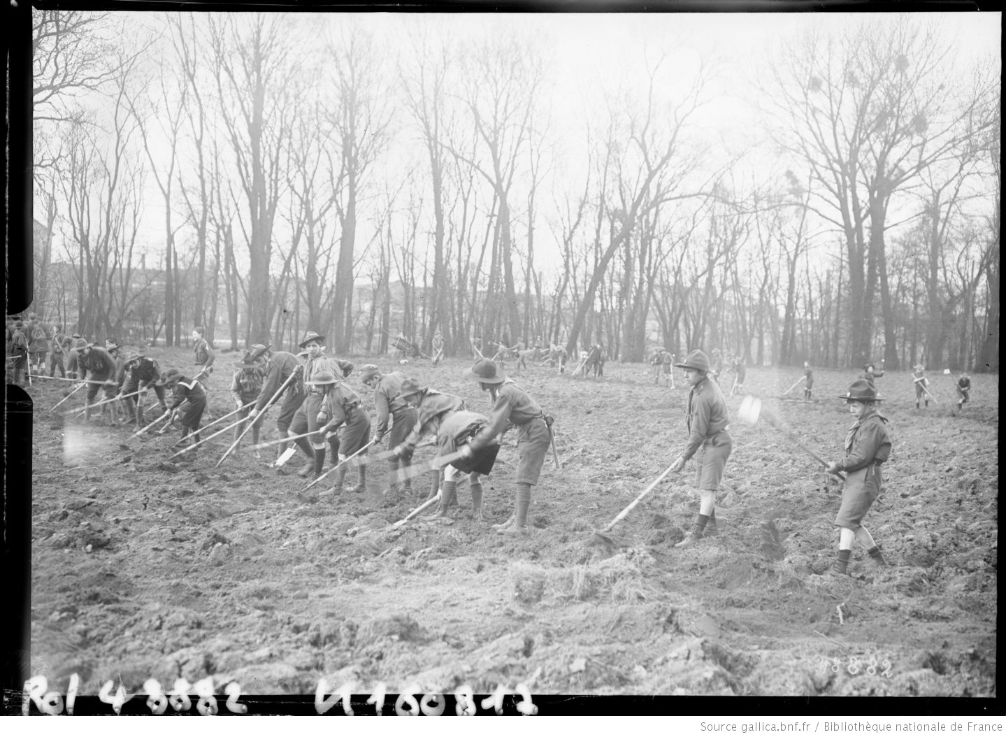 En 1917, le ministère de l’agriculture met à la disposition des éclaireurs 25 000 m² de terrain sur l’île de Puteaux, en région parisienne. Des outils sont remis aux jeunes pour défricher le terrain et ainsi, cultiver des légumes, alors que l’alimentation à Paris est toujours difficile. 12 000 kilos de pommes de terre ont été récoltés.