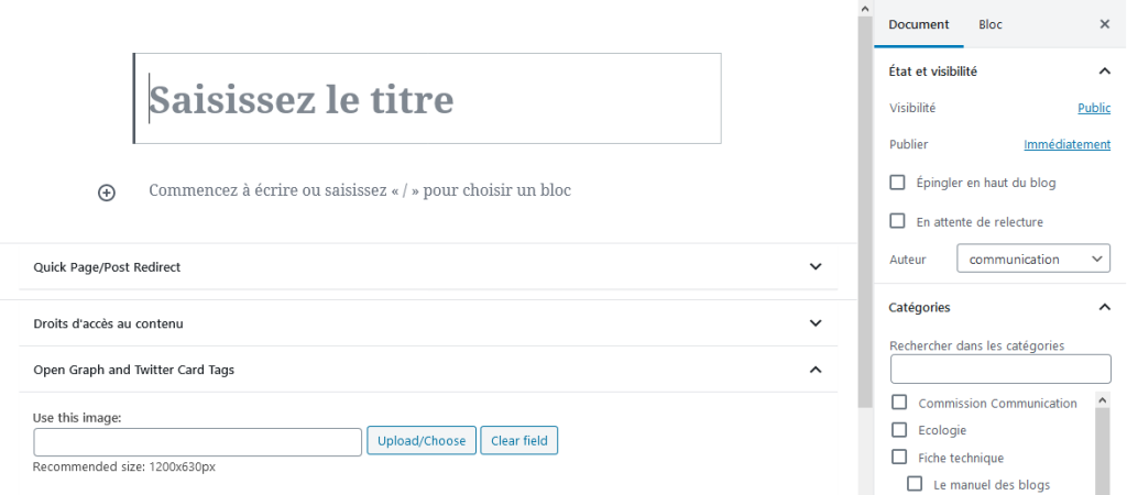 La partie du bas, Open graph, permet de définir l’image qui apparaîtra en aperçu de l’article si vous le publiez sur les réseaux sociaux. Si vous laissez ces champs vides, c’est le logo de l’association qui sera visible.