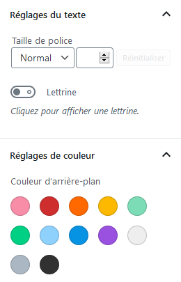 La colonne de droite donne la possibilité de personnaliser les titres et blocs avec des couleurs et tailles de polices différentes.
